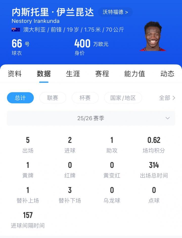 伊兰昆达现年19岁,现效力于英冠的沃特福德,本赛季已登场5次,贡献2球1助。