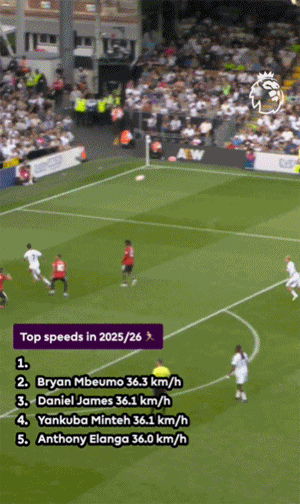 姆贝莫在英超也记录下了前三轮第二快的冲刺瞬时速度,在1-1战平富勒姆的比赛中,姆贝莫的最高时速达到了36.3公里。