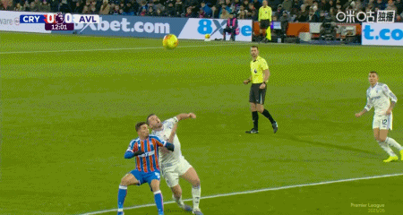 第12分钟,维拉球员举手示意米切尔手球,裁判并无表示