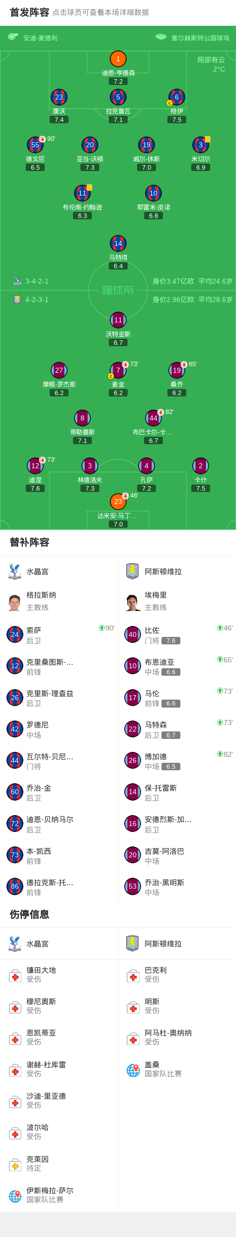 北京时间1月8日英格兰足球顶级联赛 联赛 第21轮,水晶宫主场对阵阿斯顿维拉。最终比分水晶宫 0-0 阿斯顿维拉。